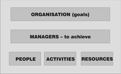 Management is about getting things done through other people. Managers strive to achieve organisational goals by arranging for others to perform whatever tasks may be necessary “not by performing themselves. Graphically, this can be represented as follows: