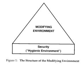 The Modifying Environment as it has been described above, represented by the triangle in Figure 1, is introduced atop this necessary foundation of security. It includes, on a planned basis, such elements as heterogeneity, unfamiliarity and unpredictability, a gap between required tasks and the individual’s current level of functioning, and the stress that results from being confronted with such situations “maintained at levels that are manageable by the student with available help.