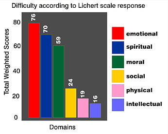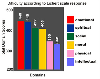 A difference in terms of total scores from all domains is shown. Whereas total possible domain scores could range to 900, results do show an overall trend for greater perceived difficulty of questions in the emotional and spiritual domains, rather than questions from the physical and intellectual domains.
