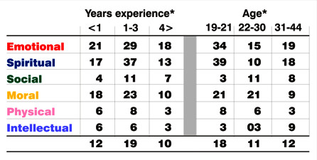 2. Did subjects' identified difficult question domains vary with age? Emotional and spiritual, and to a lesser degree, moral questions were selected as the most problematic, regardless of amount of work experience. However, respondents with less than one year and more than four years experience in child care work specifically, find emotional questions difficult, while students with one to three years experience, may find spiritual questions difficult. In all cases intellectual, social and physical questions were not considered highly difficult. Perhaps the reason workers with one to three years experience find spiritual questions more difficult is because of an interaction between age, stage of training and experience. Subsequent study would be needed to determine if subject sex is also a factor.