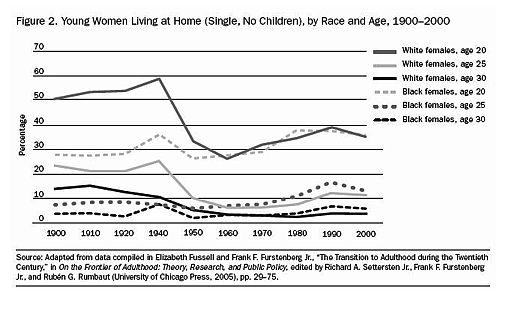 For women, it was not until the 1960s that large numbers began to live on their own before marriage, thus creating a critical “hiatus” (as sociologist Frances Goldscheider has called it) that allowed women to become more fully integrated into the paid labor market and college classrooms.11 By 1970, the share of twenty-year-olds who were living on their own before marrying was more than double that for both white men and women at the turn of the century.12 As we show later, marriage was becoming less urgent and desirable for a host of reasons, and when young people did not marry, they still considered moving out and living on their own “and women en masse did so for the first time. During this era, housing was also inexpensive, and staying with parents humiliating.