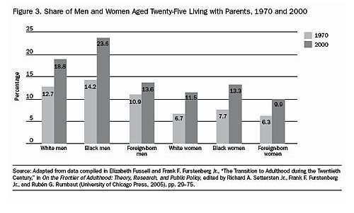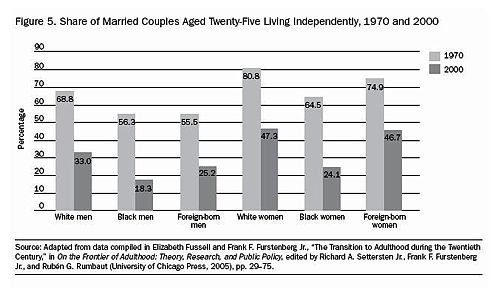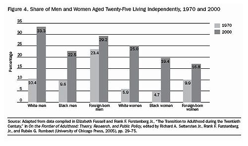 Figures 3 through 6 demonstrate how much has changed in just a generation or so. These snapshots show that in 1970, only 13 percent of white males were living with their parents at age twenty-five, compared with 19 percent in 2000. Only about 10 percent were living on their own or with roommates in 1970, compared with one-third in 2000. Most profoundly, nearly seven in ten were married in 1970, compared with only one-third by 2000. The trend, then, has been for men to move out of their parents' homes, but not into marriages or even cohabitation; by contrast, the proportion living with parents has grown only modestly. Trends are similar for women and for those of other racial and ethnic groups at age twenty-five. Half as many black men, for example, were living at home with parents in 1970 as in 2000. Likewise, the share married at age twenty-five in 1970 was triple that in 2000.