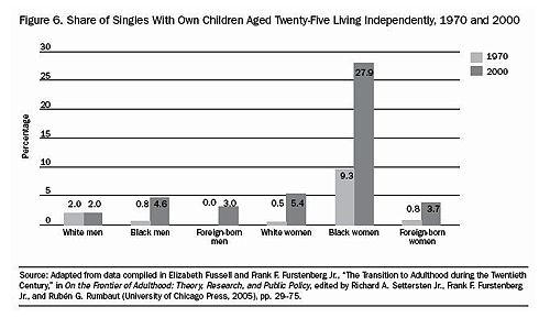 These early trends toward greater independence at the cusp of the twenties were similar for black men and women, with one exception. Black men and women were more often becoming parents (married or not).