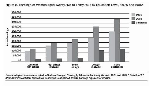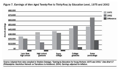 Sheldon Danziger, “Earnings by Education for Young Workers, 1975 and 2002,” Data Brief 17 (Philadelphia: MacArthur Network on Transitions to Adulthood, November 2004).