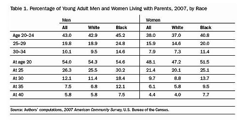 Carrying the picture forward to 2007, table 1 shows the proportion of black and white young adults, at different ages, who live with their parents. The trends in co-residence with parents evidenced in figures 1 and 2 have made dramatic leaps.8 In every age bracket men are more likely than women to live with parents. Black men live with parents more often than white men, and more often than white and black women, at every age. Black women more often live with parents than do white women, again at every age. The share living with parents is particularly high for men and women in their early twenties, spanning 43 to 50 percent depending on the group, although proportions fall as the age rises. At each five-year mark – from age twenty, to twenty-five, to thirty – percentages are cut in half. Yet even at the ages of thirty-five and forty, between 4 and 12 percent of adult children live with their parents, depending on the group.