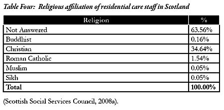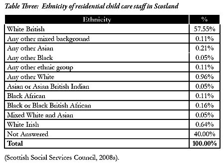 Maintaining contact with members of young people’s own faith will be important. Interestingly, the National Care Standards for care homes for children and young people omit the standard concerning the cultural and religious background of staff which is included in the National Care Standards for older people (Scottish Executive, 2005c). Perhaps this is a reflection of the similarly low numbers of ethnic minority staff in Scotland. This is demonstrated in Table Three.