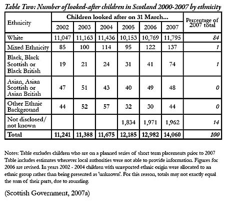 Many Scots have grown up with this sectarian backcloth but we are now a multi-cultural society. We face new challenges, including the arrival of asylum seekers and migrants from the EU accession states. Between 1991 and 2001, the size of the ethnic minority population in Scotland rose by 62.3 per cent while the overall population increased by only 1.3 per cent (Care Commission, 2008). Table Two shows the number of looked-after children from ethnic minority backgrounds.