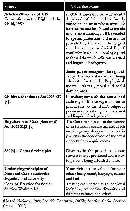Examination of personal plans often reveals poor consideration of cultural, religious and spiritual aspects, leading to an inference that few white Scottish children have needs concerning cultural, religious or spiritual identity. It might then be expected that staff would be more attentive to those from other ethnic backgrounds (Barn et al., 1997). However, a small survey in respect of the National Care Standards (Stevens and Boyce, 2006) identified staff ignorance of the faith-needs of a Muslim respondent. This led to reactive practice which was, in itself, potentially discriminatory.