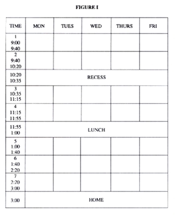 The final design, shown in Figure 1, had the five days of the week across the top of the page so that each school day appeared in one of five columns. Since Stewart had already memorized the days of the week, he would be able to find them on the schedule as required. Each column had seven “blocks” to represent the total number of class periods in each day, as well as spaces with pictures to represent recess, lunch, and the bus ride home. Because Stewart knows numbers but does not understand the concept of time, class times were shown with a number from 1 to 7 to assist him to see the sequence of events in each day.