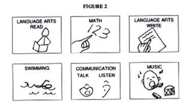 All of the symbols used to represent the different class periods displayed on the schedule were ones he had seen and used previously. The examples in Figure 2 represent his reading, writing, math, swimming, music, and communication classes. Only the various numbers have been omitted.