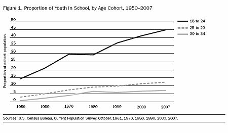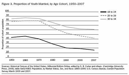 Young people today, men and women alike, aspire to jobs that require postsecondary education. It simply takes more time than it did even a half-century ago to gain a job that is secure enough to form and support a family.7 Couples do not invariably wait to marry or to have children until they complete their schooling or get a secure job, but they have more compelling reasons to do so than they did in the years after World War II, when it was still common to enter full-time, relatively well-paid (often union) work before completing high school, much less college. It follows, then, that marriage and the onset of childbearing generally take place far later in the life span than they did in the postwar period, because a growing proportion of young adults realize they cannot make sound family decisions until their economic fortunes are established.8