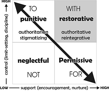 Principle 3: Those directly affected determine the outcome. Allowing those affected by the harm to make decisions that affect them requires professionals to have a belief in the participants. This challenge is not an easy one, since professionals have spent years becoming the “experts.” The social discipline window developed by Wachtel and McCold (2001) provides the cornerstone to restorative practices. (See Figure 1.) Many of us are used to serving others by doing things “for,” “to” or “against” them. Continual awareness and reflection are required to work “with” people.