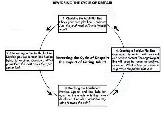 4. Creating a positive plot line. Step 4 builds on the ongoing relationship with the youth before, during, and after beginning to work on any attachment(s). It is this relationship over time that allows us as youth workers to help our charges become healthy adults, reversing the cycle of despair in a lasting way. “A child's sense of identity arises out of messages about self received from all quarters “parents, teachers, and culture, as well as from personal introspection. ... Identity is an important resource, a source of strength, a basis for resiliency in coping with the world ... both a product and a cause of behavior and development” (Garbarino, 1995, p. 89).