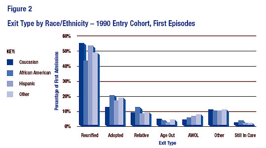 A child's age and race are associated with the likelihood that he or she will be reunified. Infants and adolescents are less likely to be reunified than children in other age groups, and African-American children are less likely to be reunified than children of other racial/ethnic backgrounds.