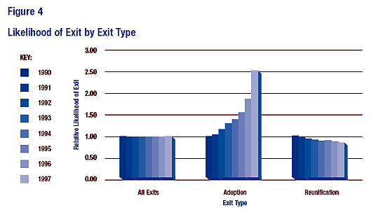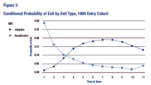 Although most children still exit foster care through family reunification, exit patterns have changed over the last 8 years. Currently, reunification takes longer to happen, whereas adoptions happen earlier.