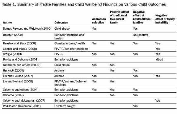 We review the evidence on the effects of fragile families on child well-being by comparing outcomes for three types of families. The first type is families where children live with two married parents (for simplicity, we refer to these as traditional families). In this category are children living with their married biological parents as well as children living with married stepparents. (Research has documented differences in outcomes between these two subgroups of children, but those differences are not our focus here.) Rather, we are interested in two other types of families – both fragile families – that have become increasingly prevalent in recent years. One is single-mother families in which the mother was not married at the time of the birth and in which she is not currently living with a boyfriend or partner. The other is cohabiting-couple families in which the mother was not married at the time of the birth but is currently cohabiting with a boyfriend or partner, who might be either the child's biological parent or a social parent (someone who is not biologically related to the child but who functions at least partially in a parental role). We do not distinguish between families that share and do not share households with extended family members or with other families or friends. We also do not distinguish between single mothers who are in a dating or visiting relationship and those who are not. Such distinctions likely matter, but our focus is on the three more general family types: traditional married-couple family, single-mother family, and cohabiting-couple family.