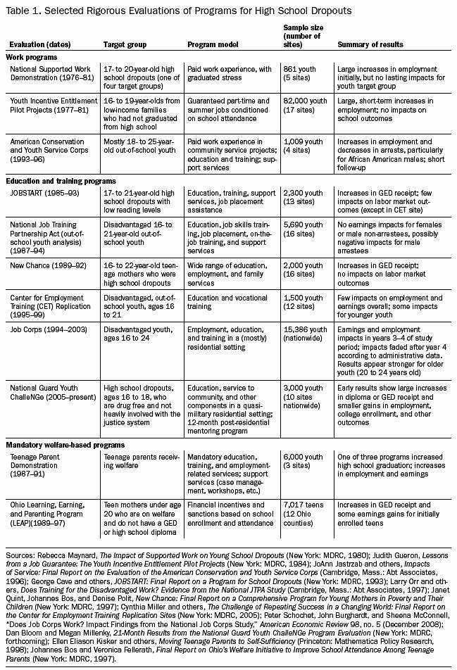 Table 1 describes eleven rigorous evaluations of employment – or education-focused programs – serving high school dropouts that have been conducted over the past thirty years (a few of the programs served both dropouts and in-school youth).15 The table focuses on major studies that used random-assignment designs, in which eligible youth were placed, through a lottery-like process, either in a program group that had access to the program being studied or in a control group that did not.16 The table does not include some specialized programs that were rigorously evaluated and may serve some dropouts, such as Multi-Systemic Therapy (a treatment approach for youth with serious behavior problems), or Structured Training and Employment Transitional Services (an employment model for young adults with developmental disabilities).17