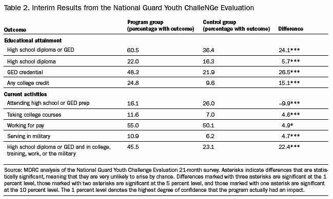 Overall, the evaluations tell a mixed story. In several, young people in the program group were substantially more likely than their control group counterparts to earn a GED or another credential. For example, in the Job Corps evaluation, 42 percent of the program group earned a GED within four years after entering the study, compared with 27 percent of the control group. Similarly, 38 percent of the program group earned a vocational or trade certificate, compared with only 15 percent of the control group. Interim results from the National Guard Youth ChalleNGe evaluation show that about 61 percent of the program group and 36 percent of the control group earned a GED or diploma within twenty-one months after study enrollment (see table 2). The JOBSTART and New Chance studies reported similar findings.