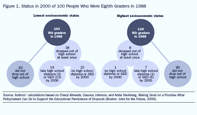 Data on dropouts by income are from 2006. See National Center for Education Statistics, Digest of Education Statistics: 2007 (Washington: National Center for Education Statistics, 2008), tables 105 and 106. Data on dropouts by race and ethnicity are from 2007. See National Center for Education Statistics, The Condition of Education (Washington: National Center for Education Statistics, 2009), table A-20-1.
