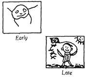 Later schemata are related to a baseline at the bottom of the picture or to multiple baselines covering the page from top to bottom. The baseline is highly significant in indicating readiness for co-operative play and thinking, such as planning and executing group murals and puppet shows.