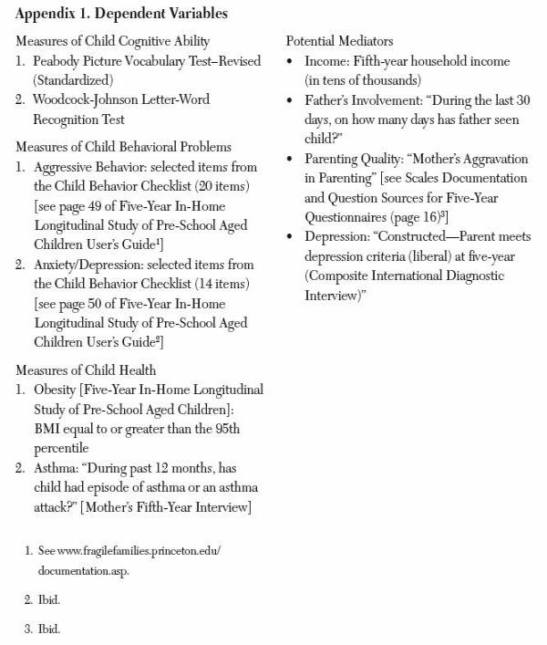 31. This research is reviewed by Sharon Bzostek and Audrey Beck, “Family Structure and Child Health Outcomes in Fragile Families,” Working Paper 08-11-FF (Princeton: Center for Research on Child Wellbeing, 2008); and by Robert Wood, Brian Goesling, and Sarah Avellar, “The Effects of Marriage on Health: A Synthesis of Recent Research Evidence,” report prepared by Mathematica Policy Research for U.S. Department of Health and Human Services, Assistant Secretary for Planning and Evaluation, 2007.