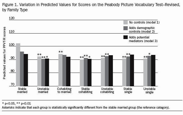 We show selected results in figures 1 through 3.64 In these figures, we show how children's predicted scores on the outcome measures vary as a function of their family type. Figure 1 displays results for the PPVT–R. In model 1, all types of nontraditional or unstable families are associated with lower scores. Results for model 2 are similar, with the exception of the cohabitation to marriage category, which is now no longer significantly different from the stable married category. In model 3, the possible mediators explain some, but not all, of these negative effects.