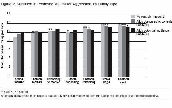 The findings for aggressive behavior are shown in figure 2. In model 1, just as with the results for cognitive outcomes, all types of nontraditional or unstable families are associated with worse scores (in this case, because the outcome variables are ratings of behavior problems, higher scores indicate worse outcomes). However, in contrast to the results for cognitive outcomes, it appears that for aggressive behavioral problems, growing up with a single mother (stable or unstable) is worse than growing up with a cohabiting mother. The effects of growing up with a single mother are larger in model 1 and are more likely to remain significant after controlling for demographic differences (model 2) or demographic differences plus possible mediators (model 3).