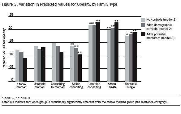 Results for the health outcomes reveal a different pattern. Figure 3 shows that for obesity, the worst outcomes, across all three models, are associated with growing up with a single parent (whether stable or unstable) or an unstable cohabiting parent. This pattern is true as well for asthma,65 although after controlling for demographic differences (or demographic differences plus the possible data from FFCWS to examine the effects of family structure in early childhood. The FFCWS studies add to a large body of earlier work that suggested that children who live with single or cohabiting parents fare worse as adolescents and young adults in terms of their educational outcomes, risk of teen birth, and attachment to school and the labor market than do children who grow up in married-couple families. Until recently, most of this research focused on divorced parents. The sharp rise over the past few decades in births to unwed mothers, however, has shifted the focus to unmarried single and cohabiting parents. These demographic changes make it difficult to compare research done even ten or fifteen years ago with research on cohorts from the beginning of this century. Rapid changes in the characteristics of parents over time also could result in different selection biases in terms of which parents (both mothers and fathers) have children when married or when unmarried (for example, as the pool of parents having mediators), instability appears to be most important (with the worst outcomes found for children of unstable single or unstable cohabiting mothers).